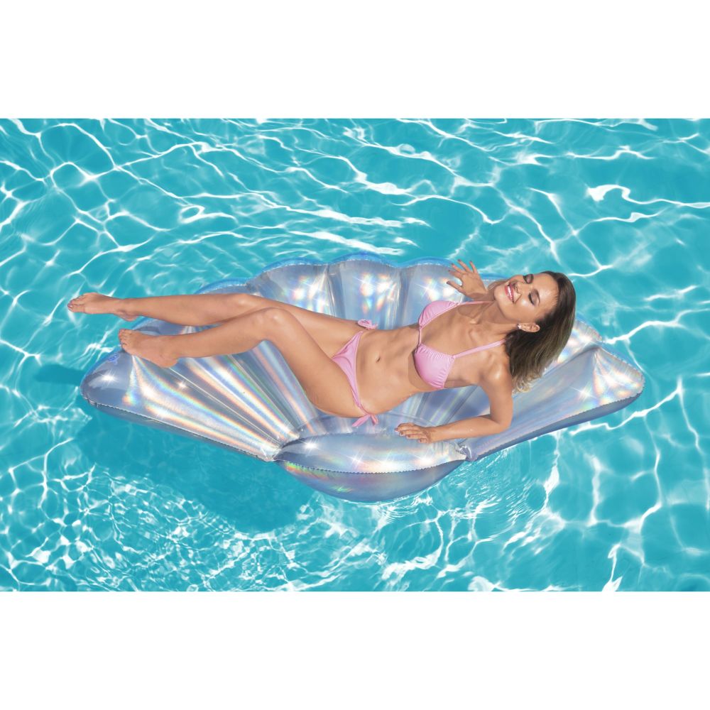 Get your color on with the Bestway Iridescent Shell Lounge. The shiny, luminous material, plus the unique clam shell design, gives a unique twist to your typical pool floats. This shimmering pool float will let colors shine as you enjoy the day at the pool or lake. The special PVC catches sunlight and everyone?s eyes, leaving you glowing in the pool. Glamorous, totally Instagram-worthy, and the perfect size for sitting, lounging and floating in the pool. Be the talk of the party with the Bestway Iridescent Shell Lounge!