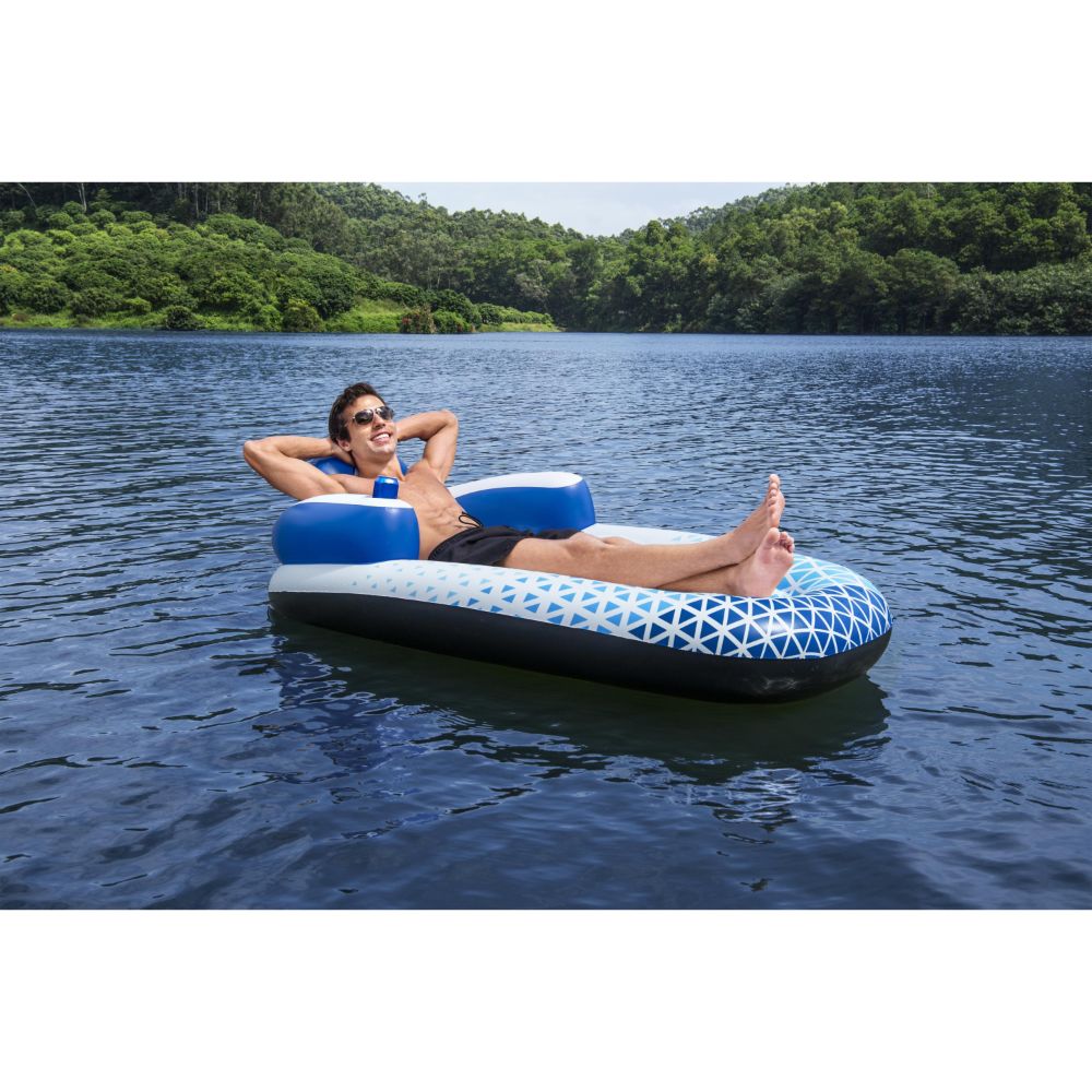Float down the river, on the lake or in the pool in comfort and style with the Hydro-Force™ Indigo Wave™ Lounge! The Indigo Wave is made with Inflata-Shield™ material to prevent damage. This thicker material resists puncture, limits stretching and enhances grip. The premium construction also features armrests and a headrest for ultimate comfort out on the water. A built-in cup holder allows you to keep your favorite snacks and drinks conveniently close by throughout the day. The upgraded 2-way interlocking quick release valve is larger, offering faster and easier inflation and deflation. Once deflated, this lounge is a breeze to store away until the next time you want to hit the waves. Your day on the water with your friends or family wouldn’t be complete without the Hydro-Force Indigo Wave Lounge to lay back and relax on!