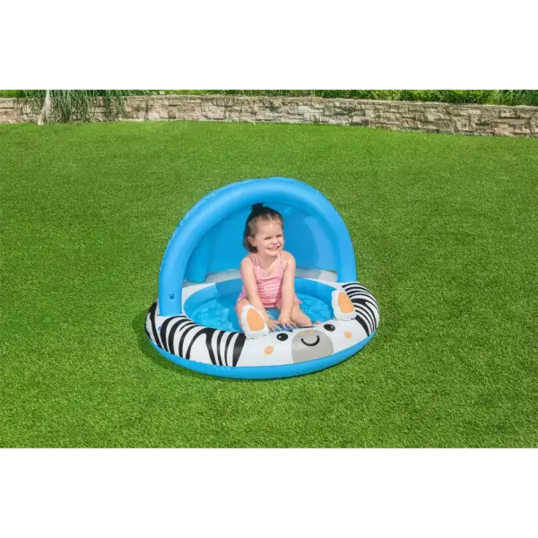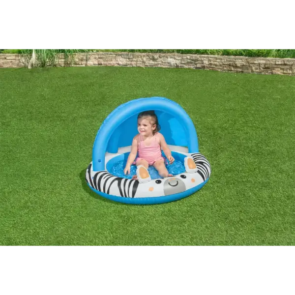 Your child can have their own water adventure right in your backyard with the Bestway® Safari Sun™ Shaded Baby Pool! Designed for children ages 2 and up, the Safari Sun Baby Pool features friendly zebra graphics and includes an inflatable UV Careful™ sunshade to protect your little one from the sun’s harsh rays as they play. Plus, there’s also an inflatable floor to provide extra comfort as they splash and sit in the shade. The Safari Sun’s compact design makes it ideal for a backyard or small patio, and the pool can easily be inflated, deflated, and stored for seasons to come. Playtime has never been safer or more comfortable than with the Bestway Safari Sun Shaded Baby Pool!