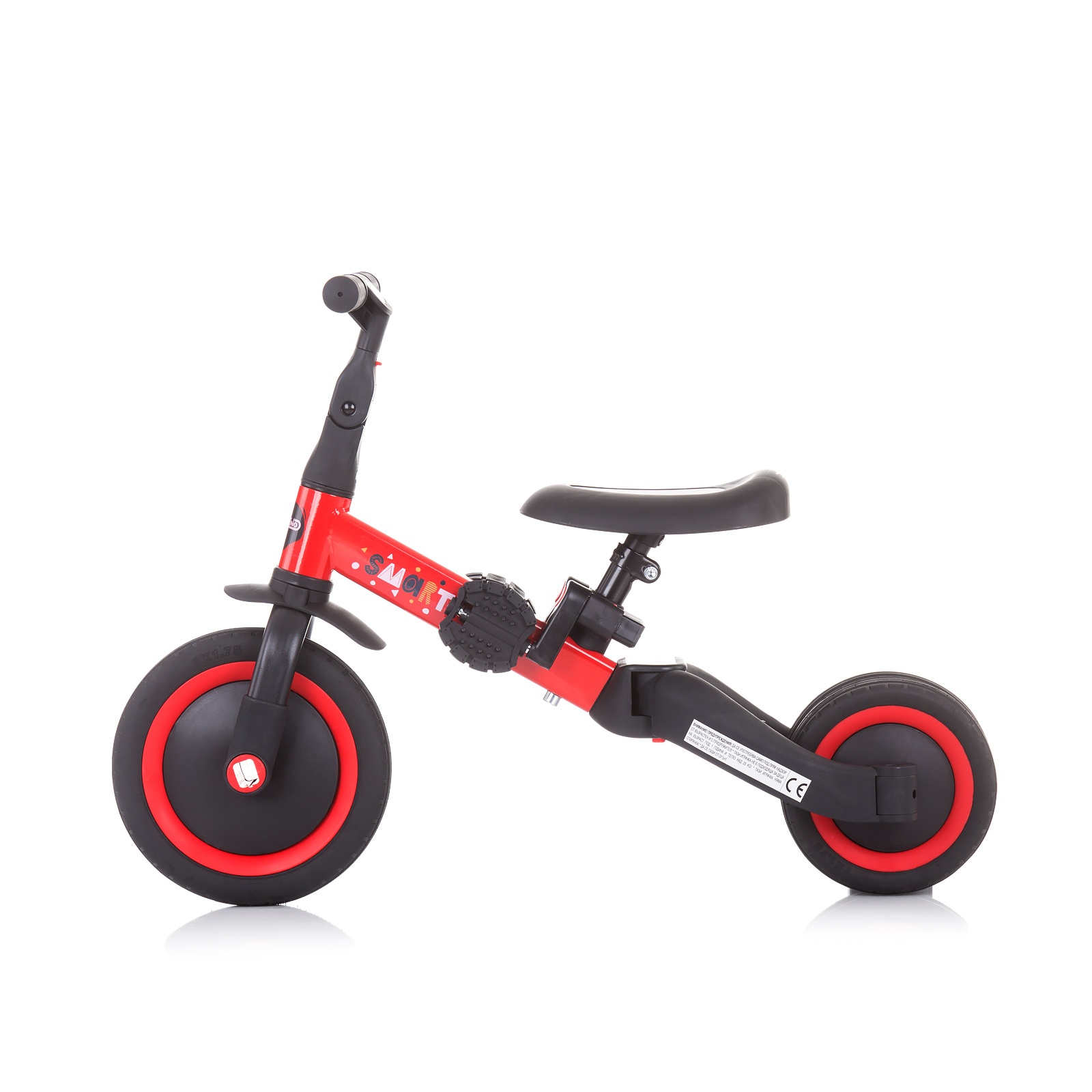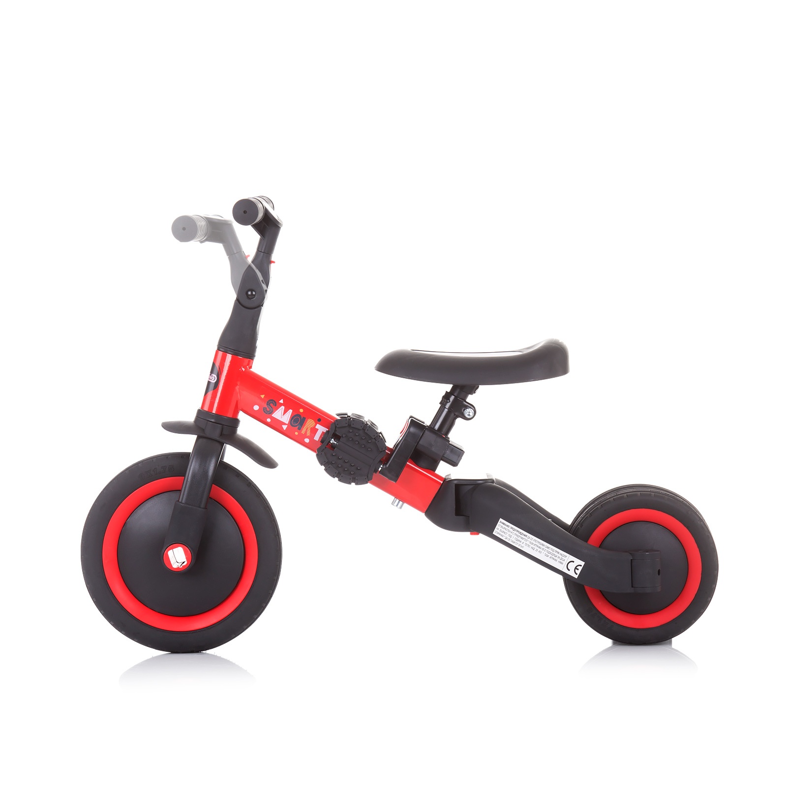- Лесно се претвора од трицикл во баланс велосипед преку механизам за „клик“.