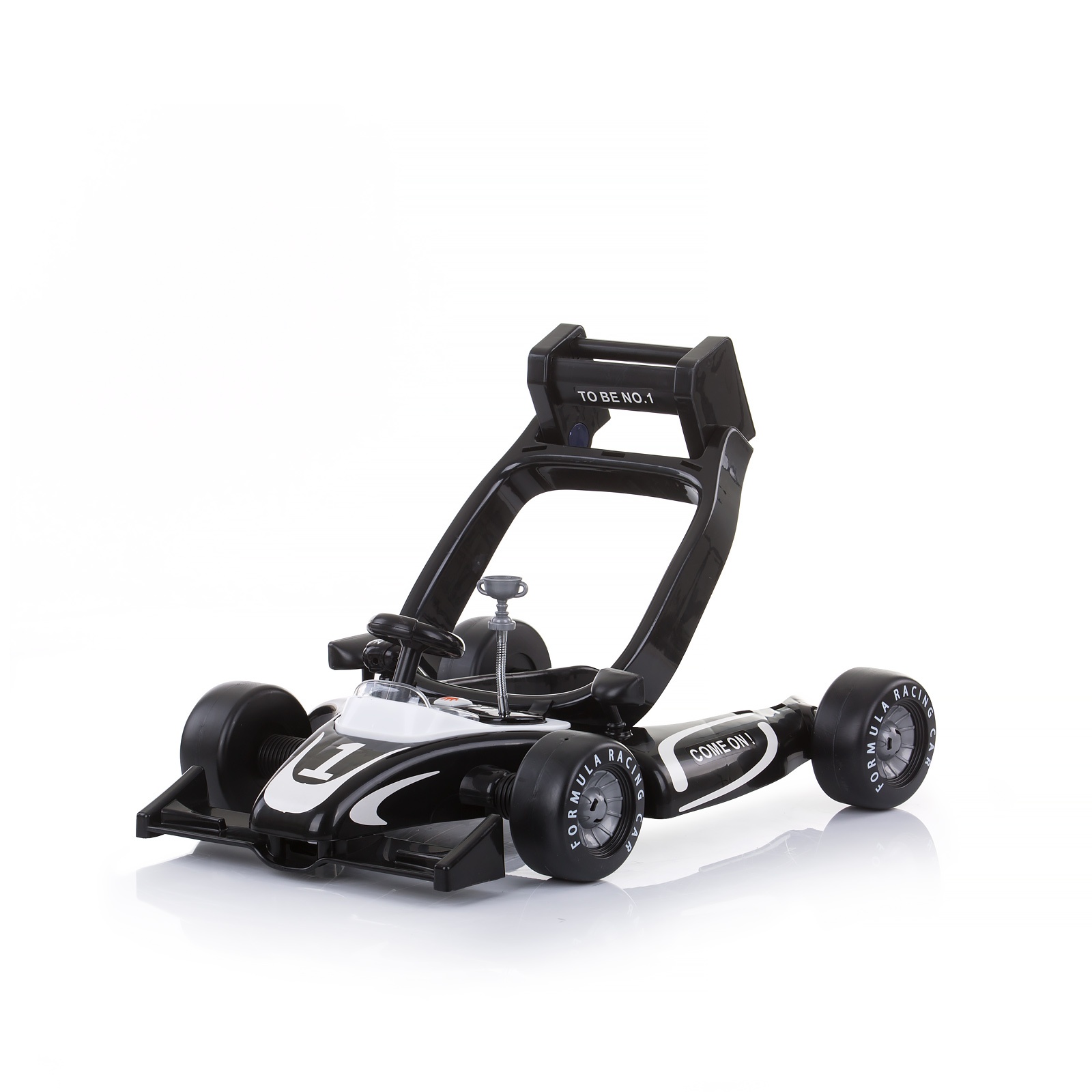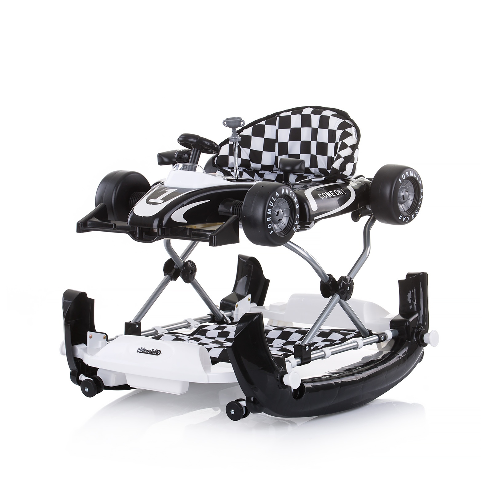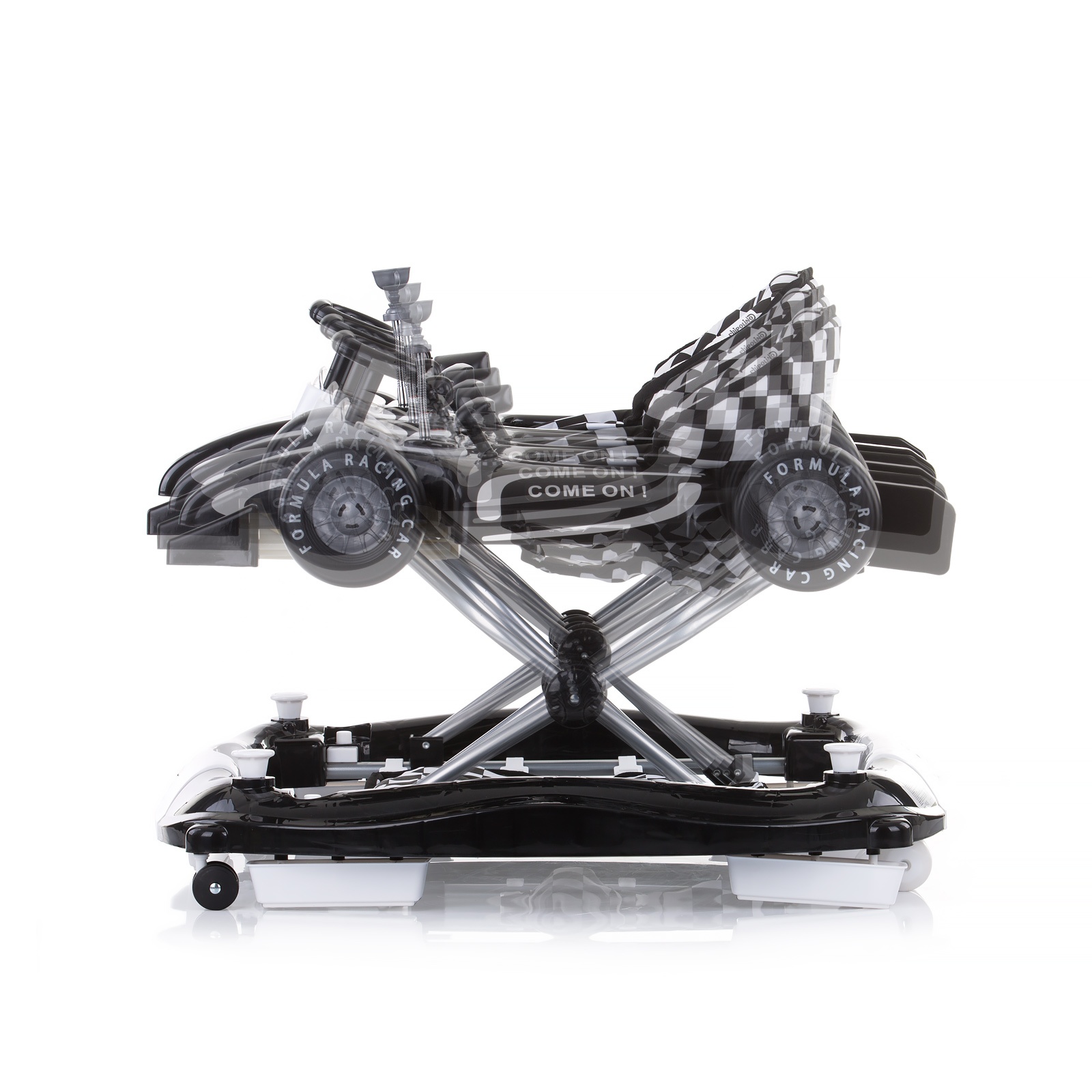Бебешката проодувалка  RACER 4 во 1 го поттикнува бебето да направи свои први чекори и го подобрува неговиот баланс и координација. Боите и звуците на подносот со играчки и музички панел ја стимулираат креативноста на детето и ги развиваат неговите вештини за слух и вид. Функцијата на бебешката проодувалка додава забавно искуство за и бебето и родителот.