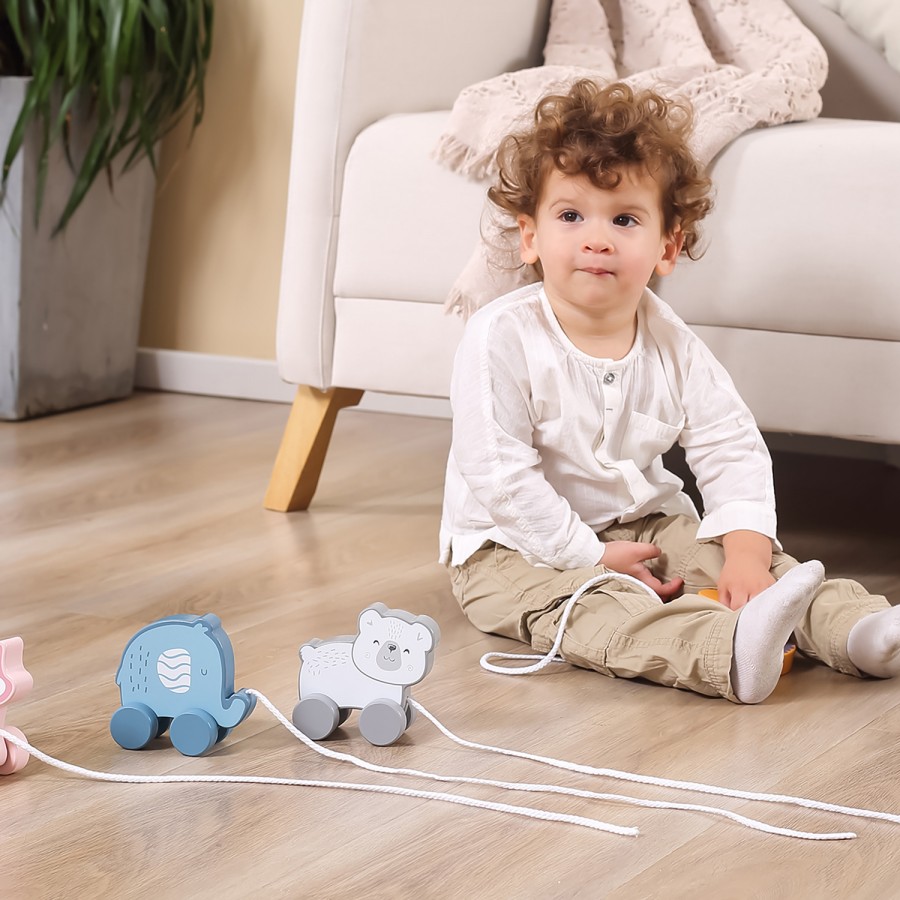 Слатка дрвена поларна мечка на тркалца која децата можат да ја влечат, идеална за поттикнување на првите чекори и развој на моторните вештини.