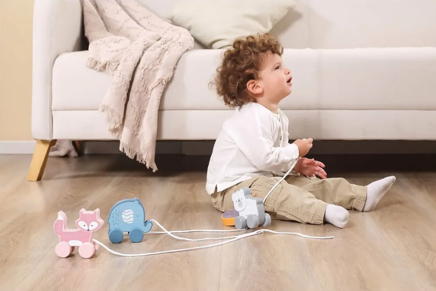 Изработено е од висококвалитетно дрво и обоено со безбедни, нетоксични бои. Играта со влечење го поттикнува развојот на координацијата, стабилноста и самодовербата при првите чекори.