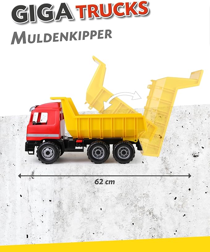 Дома Играчки Камиони Lena GIGA TRUCKS Mercedes-Benz Actros Dump Truck– голем камион со три челични оски и заклучувачка каросерија