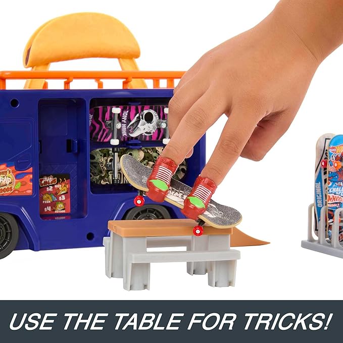 Hot Wheels Skate Taco Truck Play Case – пренослив сет за фингерборд со скејт парк, 1 ексклузивна табла, 1 пар отстранливи скејт чевли и простор за складирање.