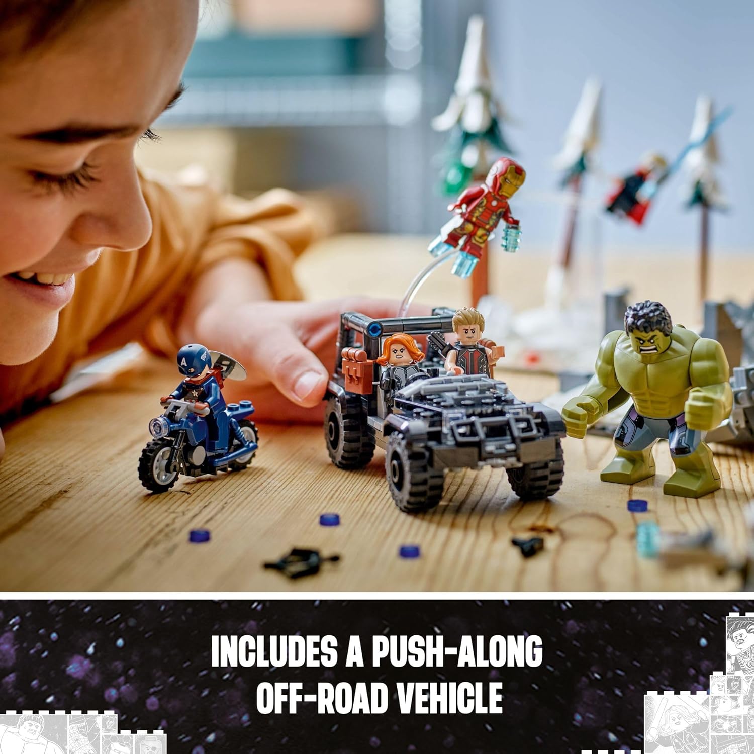 Со над 600 коцки, овој сет е одличен за млади градители и фанови на Марвел од 9 години и постари. Вклучени се познатите херои: Iron Man, Thor, Captain America, Black Widow, Hawkeye и масивниот Халк – подготвени да се спротивстават на војниците на Хидра.