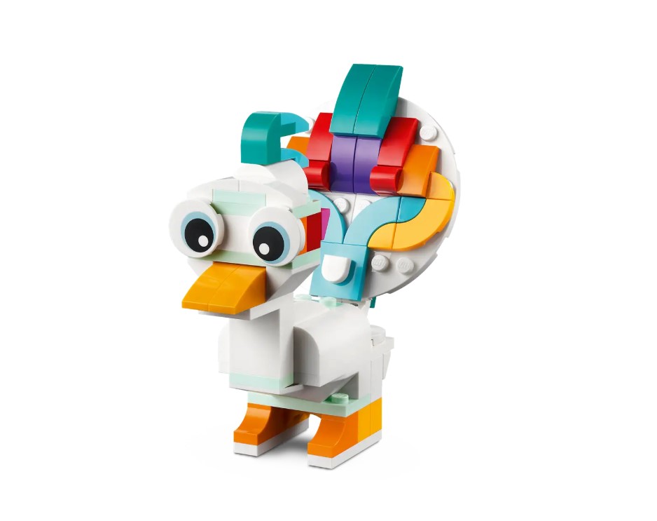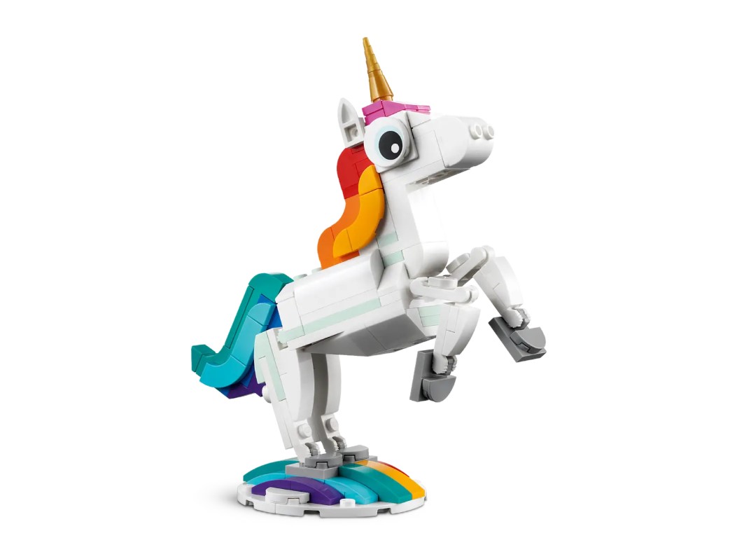LEGO® Creator 3-в-1 31140 „Магичен еднорог“ им овозможува на децата да ја разбудат својата фантазија и да создадат три различни модели од еден сет. Главниот модел е шарен еднорог со златен рог и подвижни делови, кој може да се постави на виножитен постамент. Но, забавата не завршува тука – од истите коцки може да се изгради елегантен морски коњ или шарен паун, што носи уште повеќе можности за креативна игра. Овој сет инспирира креативност, вештини за градење и имагинација, нудејќи уникатно искуство секој пат кога ќе се состави нешто ново.
