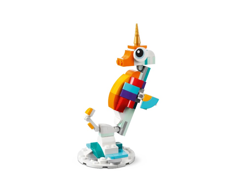 Внеси волшебна креативност во играта со овој 3-в-1 сет – изгради еднорог, морски коњ или паун и уживај во бескрајни фантастични авантури.