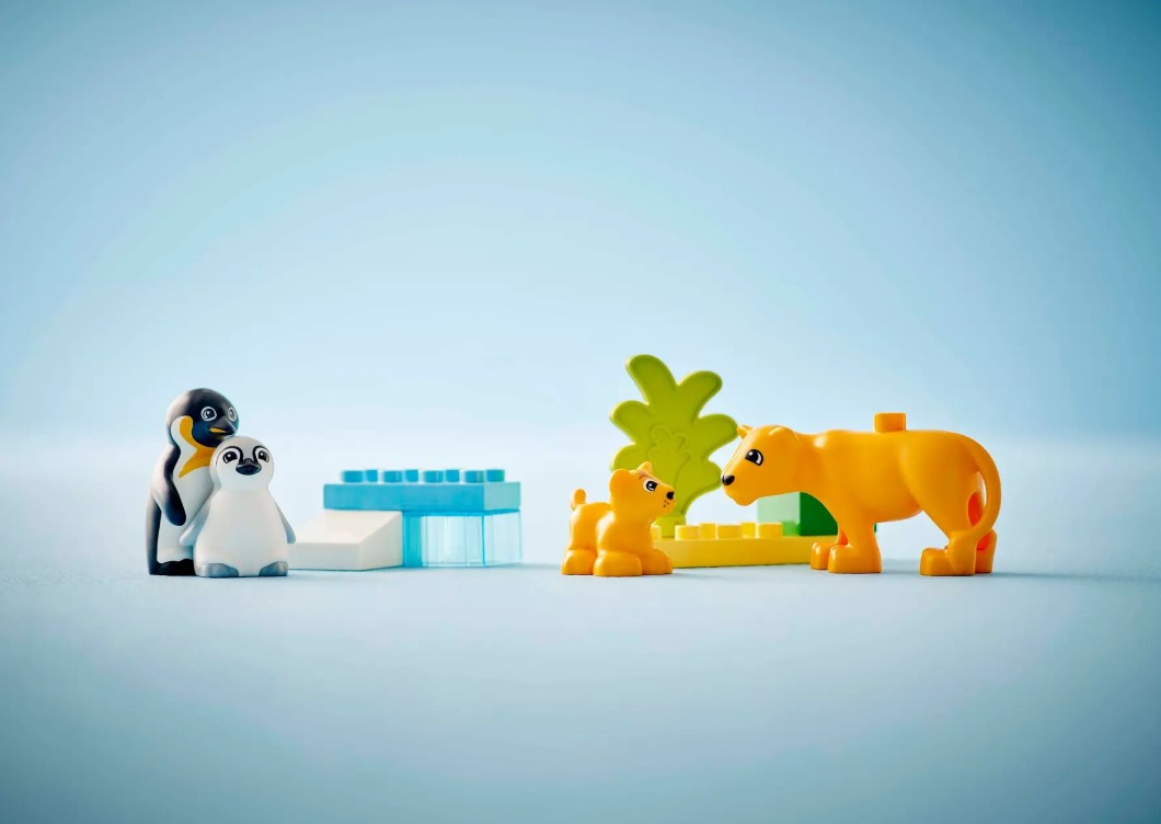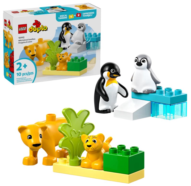 LEGO® DUPLO® 10442 „Диви животински семејства: Пингвини и лавови“ е дизајниран да им овозможи на најмалите деца да го откријат животинскиот свет преку игра исполнета со боја и нежност. Сетот содржи возрасни и бебешки фигури на лавови и пингвини, со кои децата можат да создаваат приказни, да ја развиваат својата имагинација и да учат за животните во нивните природни средини. Благодарение на големите и безбедни DUPLO коцки, сетот е идеален за мали рачиња, поттикнувајќи ги моторните вештини, креативноста и љубовта кон природата. Комбинирај го со други DUPLO сетови за уште поголема забава и интерактивно учење.