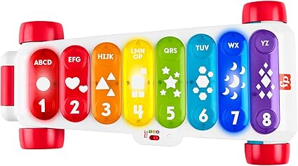 Fisher‑Price голем ксилофон што светка – со 8 шарени светлечки копчиња, 60+ песни и звуци, и рачка за влечење. За бебиња и деца од 9 до 36 месеци.