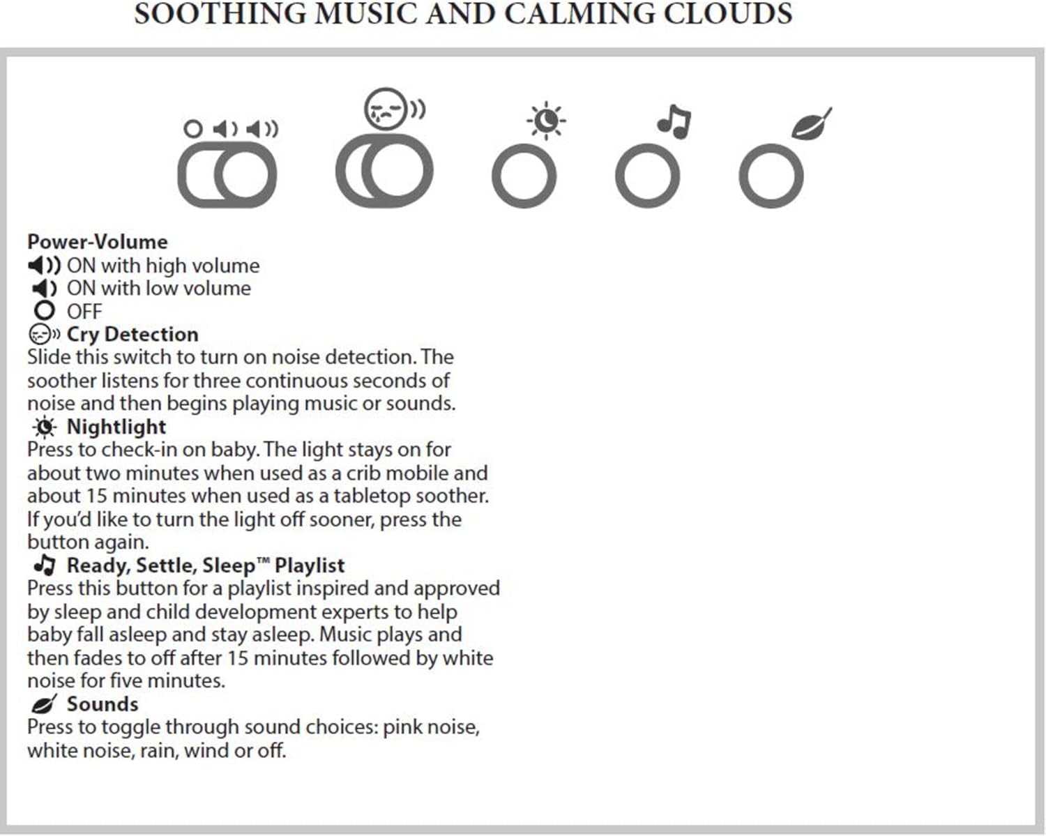 • Вклучува „Спиј добро, мал ангел“ плејлиста со музика и звуци одобрена од експерти за спиење, како и нежни светла кои помагаат бебето полесно да заспие и да спие подолго