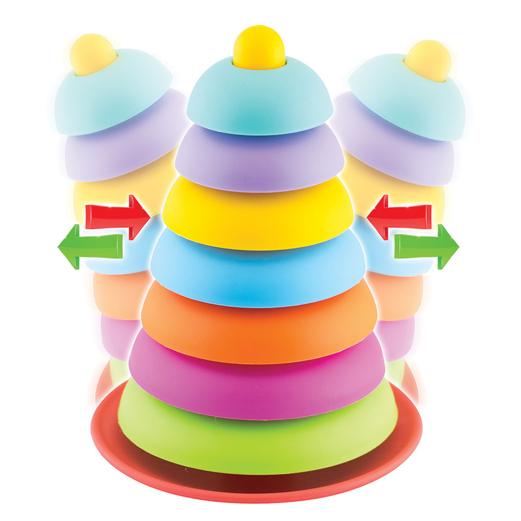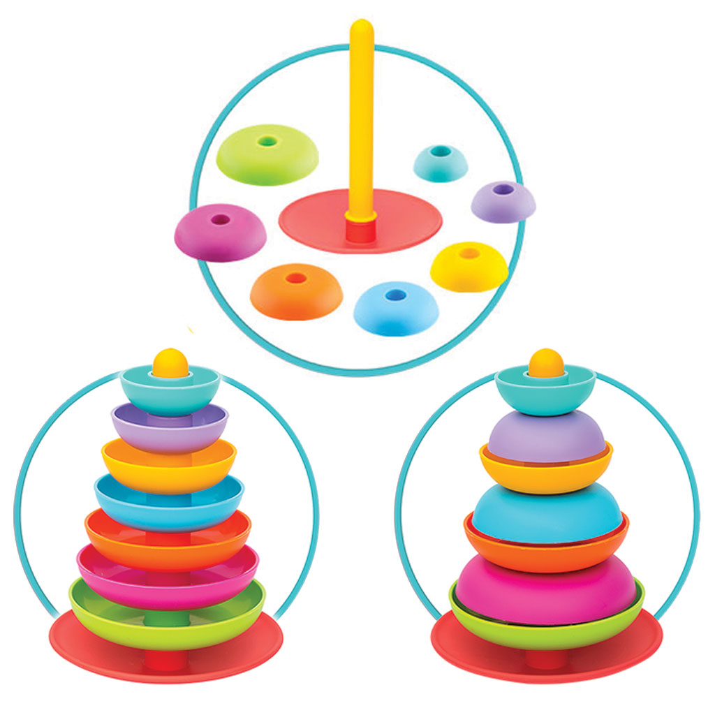 Производот се состои од 9 дела. Играта вклучува редење на 7 прстени од различни големини на кула. Основата е подвижна. Им помага на бебињата да запознаат нови форми и бои. Ги развива моторните и сетилните способности. Ги подучува на решавање проблеми. Производот ги има поминато сите здравствени тестови.