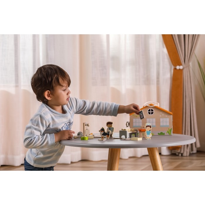 Изработен е од висококвалитетно дрво и обоен со безбедни, нетоксични бои. Освен што нуди часови забава, овој сет поттикнува емпатија, имагинација и развој на фини моторички вештини.