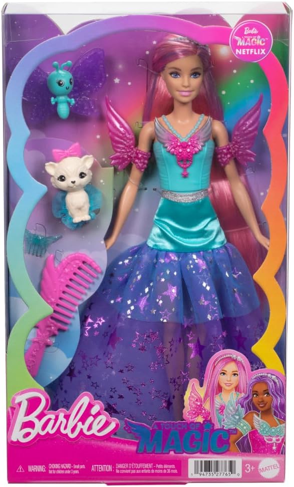 Вдахновена од нејзиниот светкав изглед во „Barbie: A Touch of Magic“, куклата Barbie „Malibu“ Roberts доаѓа со фантастичен фустан, магични миленичиња и прекрасни додатоци!