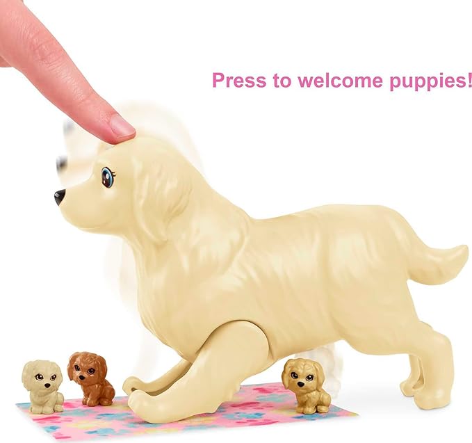 Слаткото кученце на Barbie наскоро ќе стане мама, а децата можат да помогнат при доаѓањето на свет на новите кутриња со овој забавен сет за игра.
