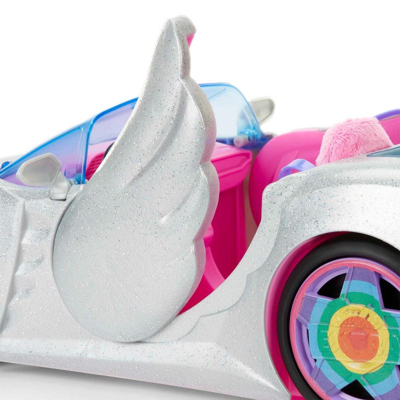 • Кабриолетот со две седишта има врати инспирирани од крилја, виножитни тркала и багажник со базенче за миленичиња. Хаубата се отвора за да складира дополнителна облека!