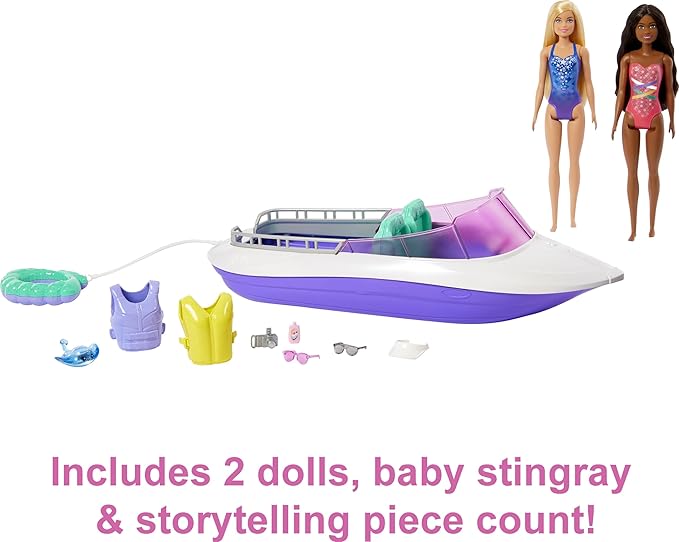 Инспириран од Barbie Mermaid Power, овој сет вклучува две кукли и брз чамец долг 45 см со елегантен дизајн и места за седење за 4 кукли.