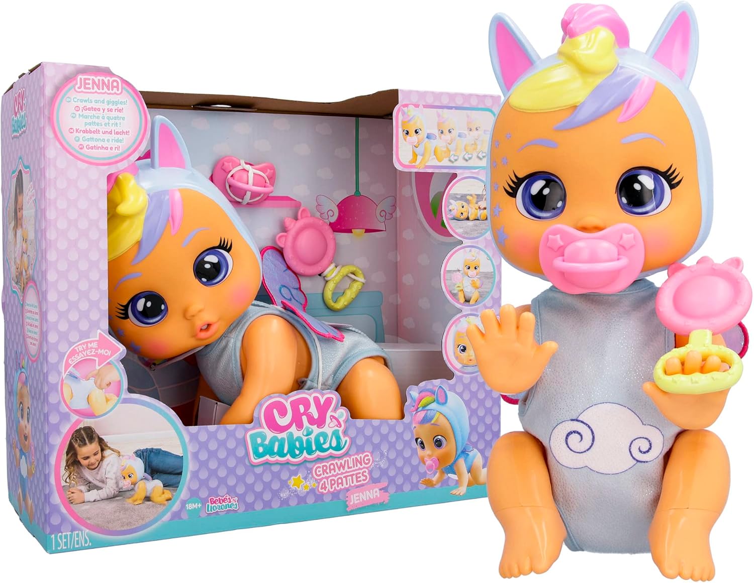 Подгответе се за уште повеќе забава со Jenna – интерактивна кукла која ползи и пушта 35 реалистични бебешки звуци за автентично искуство. Таа е совршена за развивање на имагинацијата и грижата кај малите деца.