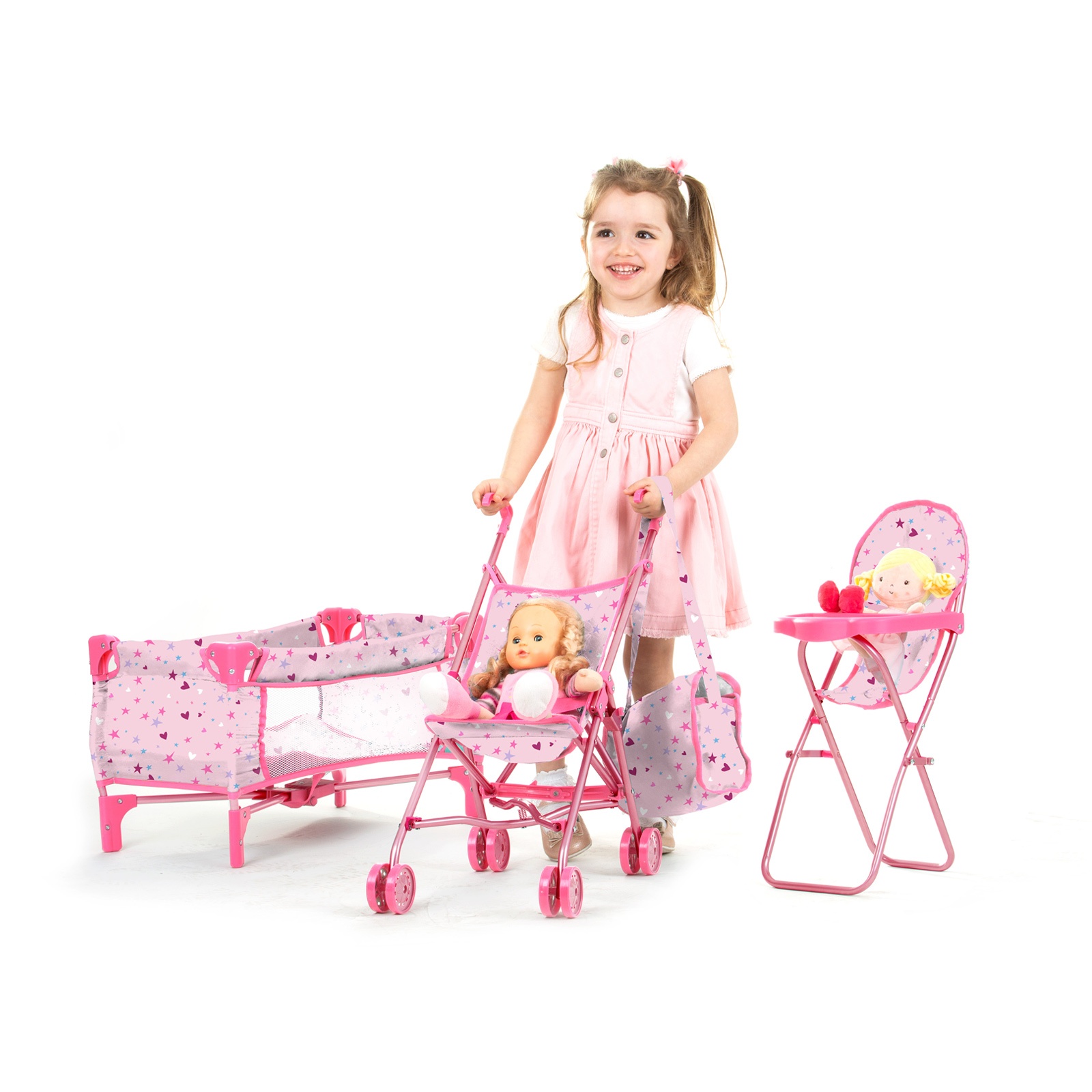 • Комплетот вклучува количка за кукли, торба за пелени за детето, висока столица за куклата, игралиште за кукла, торба за носење за игралиште за кукла.